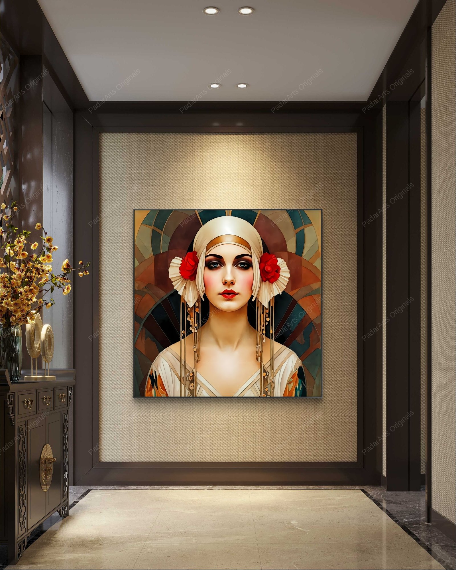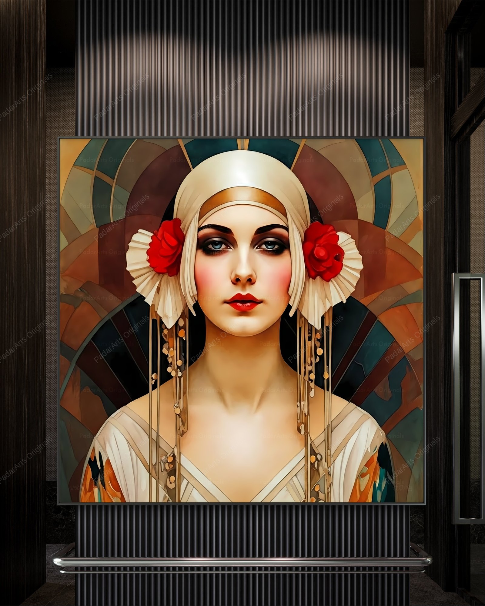 Art Deco Beauty is a stunning portrait of a glamorous woman with a captivating gaze. The artwork perfectly embodies the essence of the Art Deco era, a time of elegance and modernity. Her striking headdress, a masterpiece of geometric design and bold lines, commands attention and speaks to the era’s fascination with ornamentation and luxury. The artist masterfully utilizes vibrant colors and stylized forms, reminiscent of the era’s posters and fashion illustrations. Her elegant pose and sophisticated expression convey a sense of confidence and allure, capturing the independent spirit of the modern woman. This portrait not only celebrates the beauty of its subject but also transports the viewer to a bygone era of glamour and sophistication.