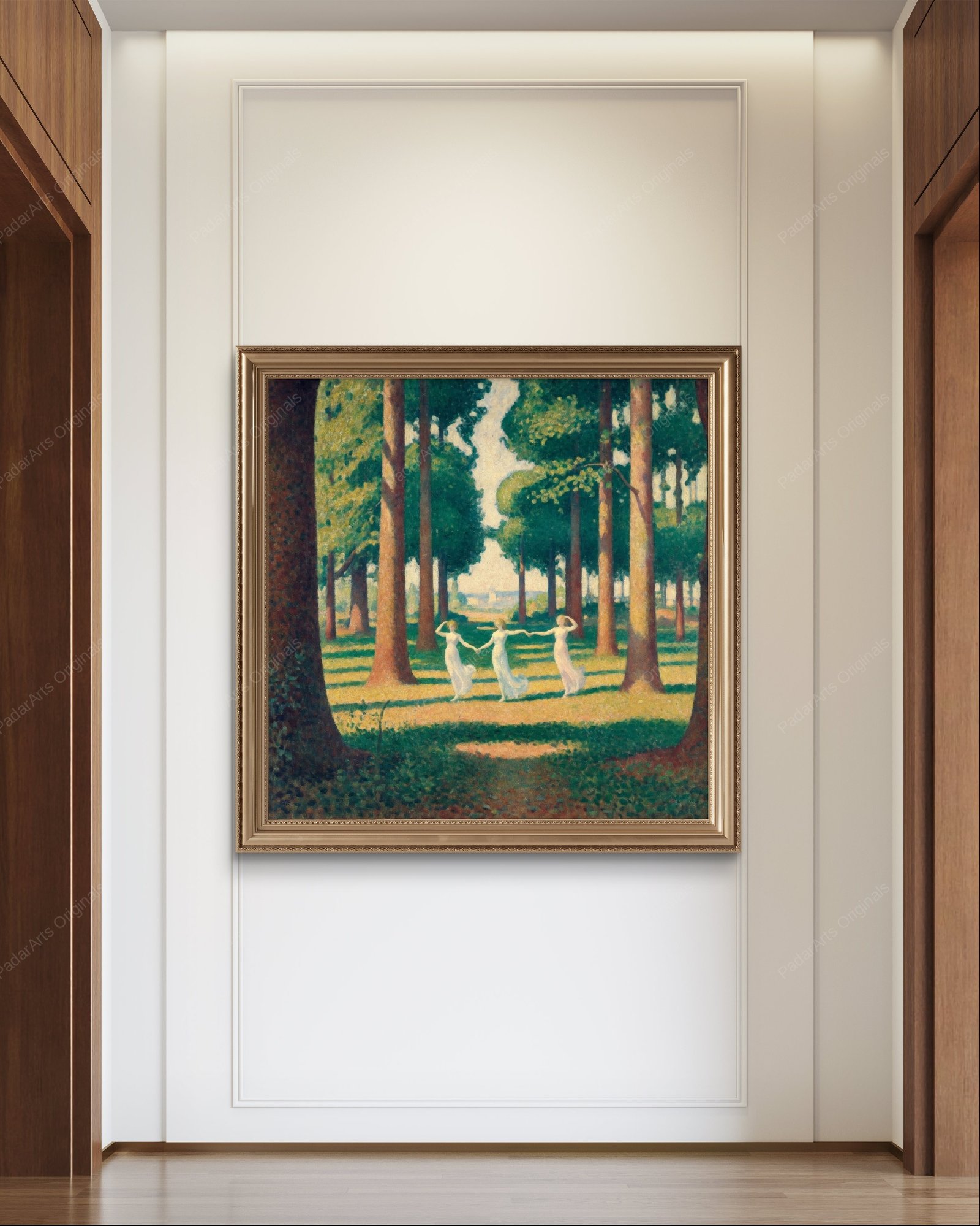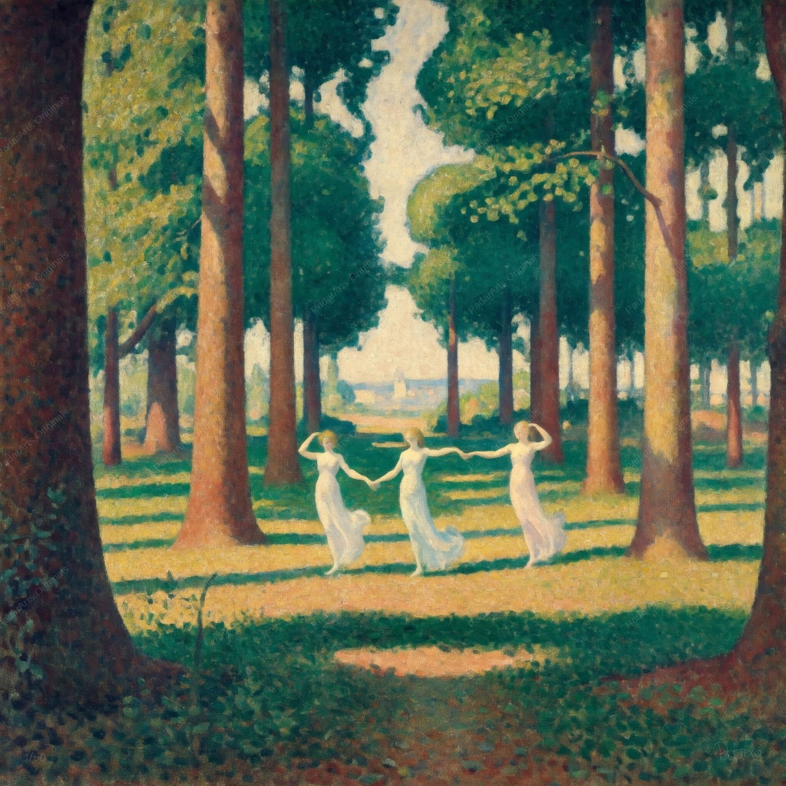This captivating pointillist work evokes the serene beauty of a sun-drenched forest glade. Three ethereal figures, clad in flowing white, engage in a graceful dance, their movements echoing the gentle sway of the trees. Rendered in meticulous detail, the canvas shimmers with a myriad of tiny dots, creating a mesmerizing interplay of light and shadow. Inspired by the techniques of Georges Seurat (1859-1891), the artist masterfully captures the tranquility of the scene, inviting the viewer to lose themselves in its peaceful ambiance. The rich greens and earthy browns of the forest floor contrast beautifully with the luminous white of the figures’ dresses, creating a harmonious balance of color and form. This piece is a testament to the enduring power of pointillism to evoke both a sense of wonder and a deep appreciation for the natural world.