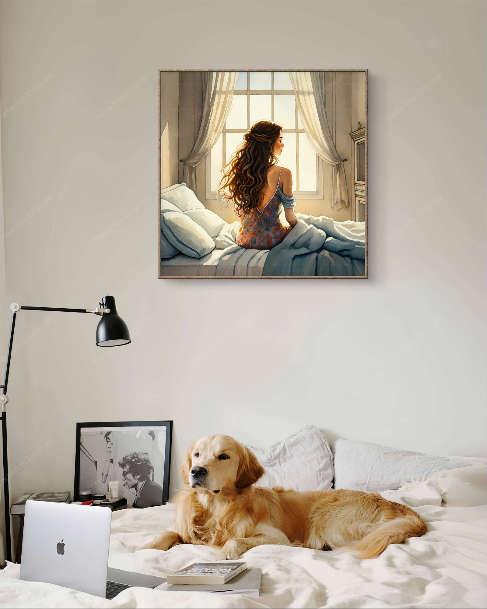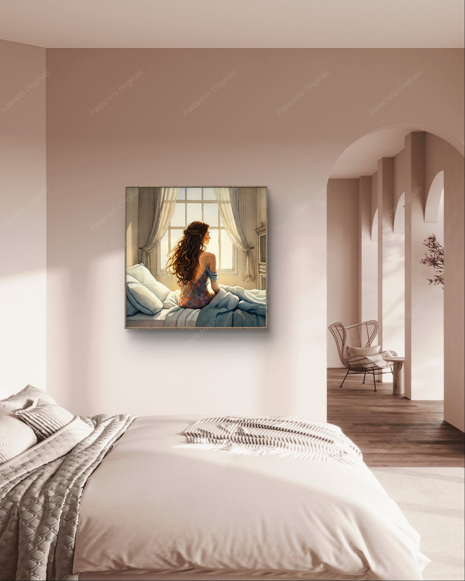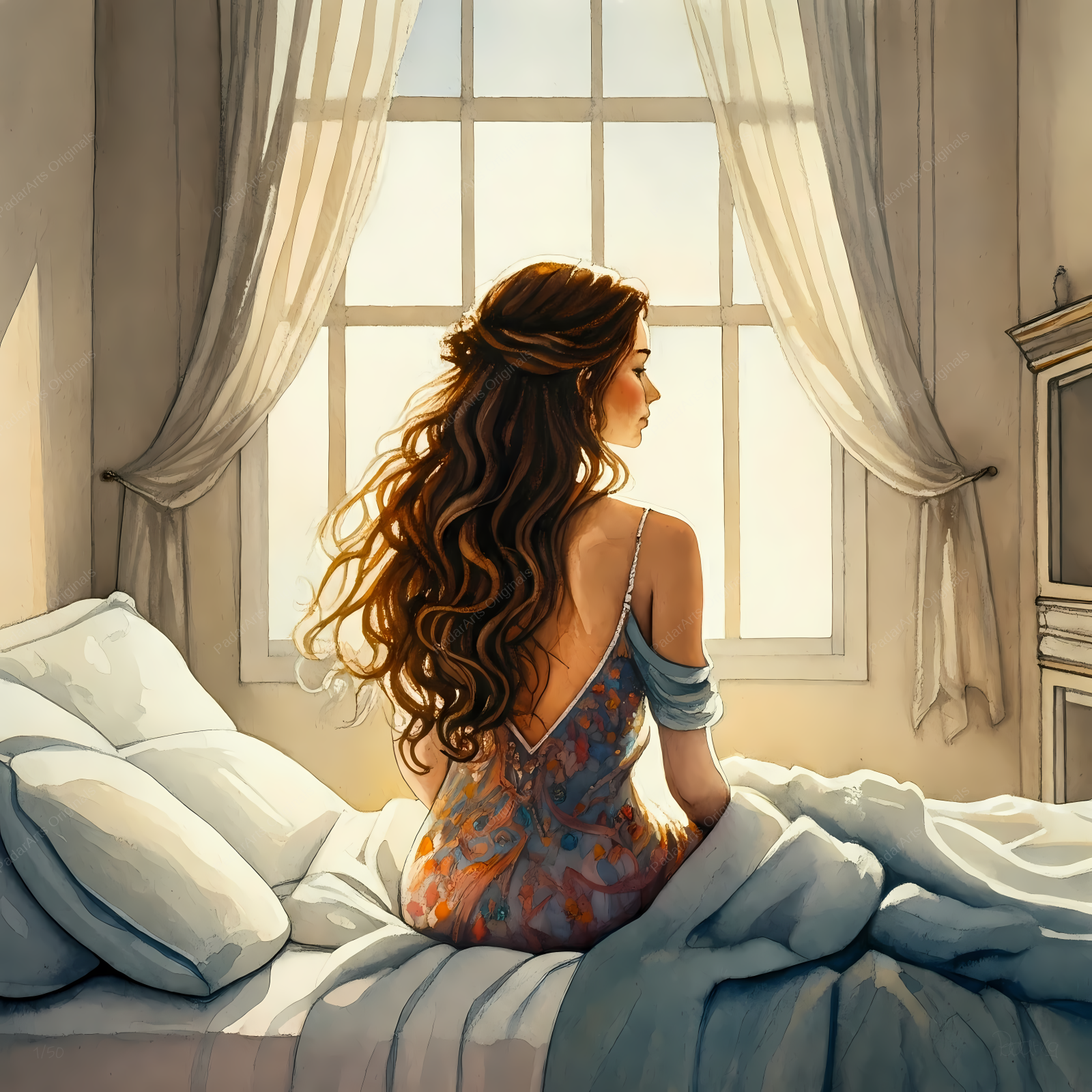 The scene is an intimate moment captured in a watercolor-like work. A beautiful female figure with long brown hair sits on the edge of her bed with her back to the viewer but looking to the right as if someone else also were in the room. The morning sun shines through the window, casting a warm light on the room. The woman’s posture is calm, but at the same time suggests contemplation. What can she think of? The soft shades of watercolor create a peaceful atmosphere and invite the viewer to share this moment.