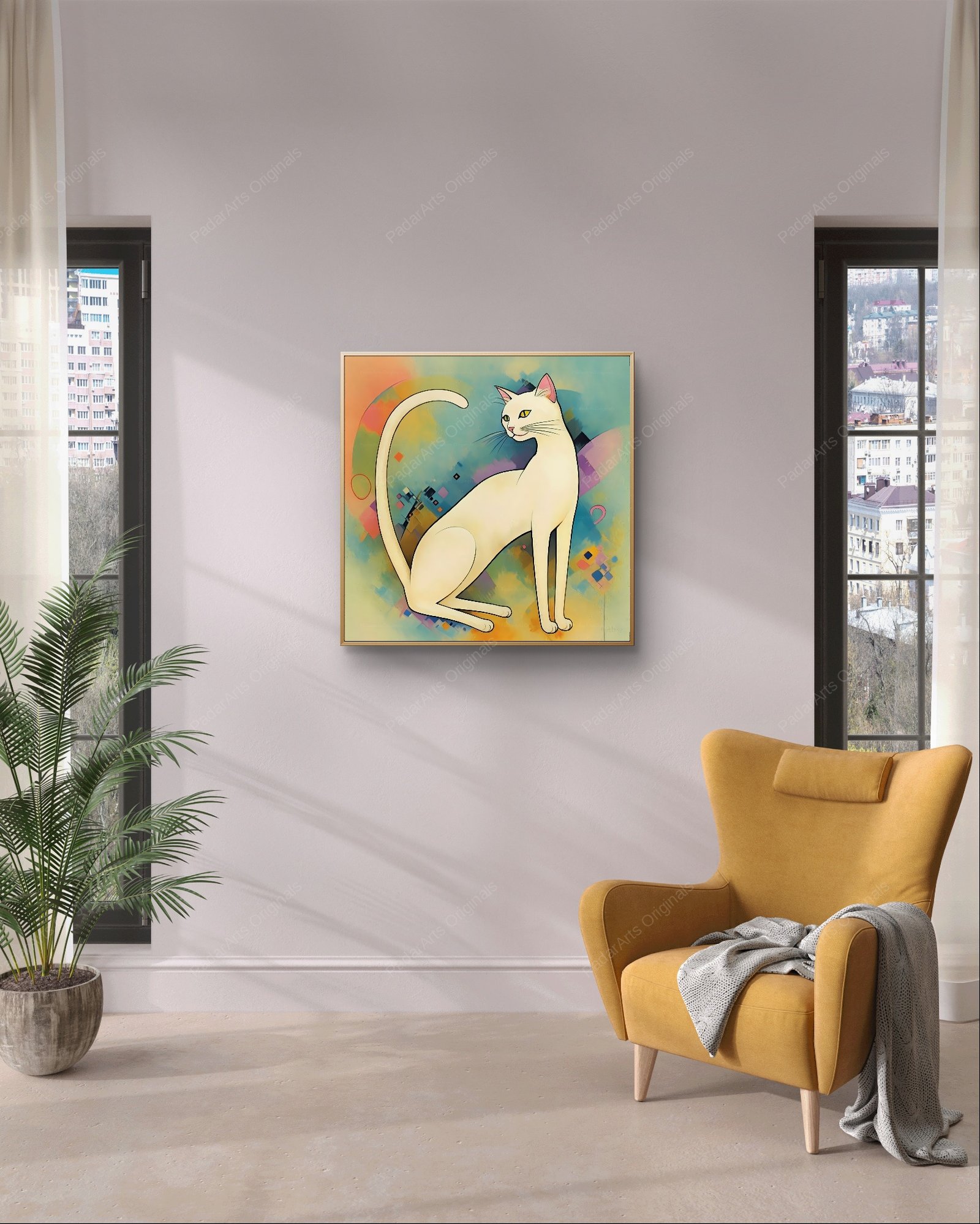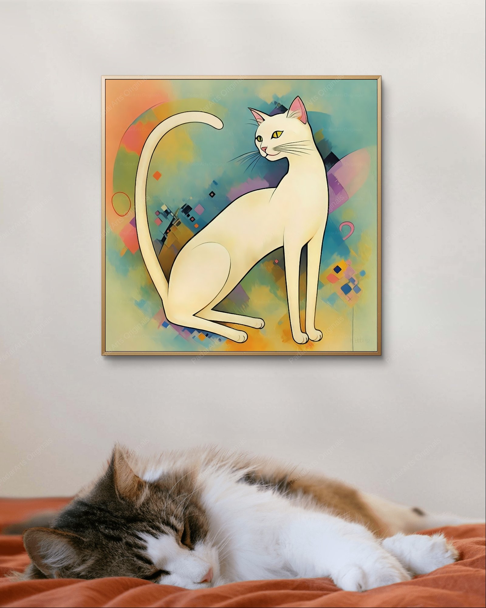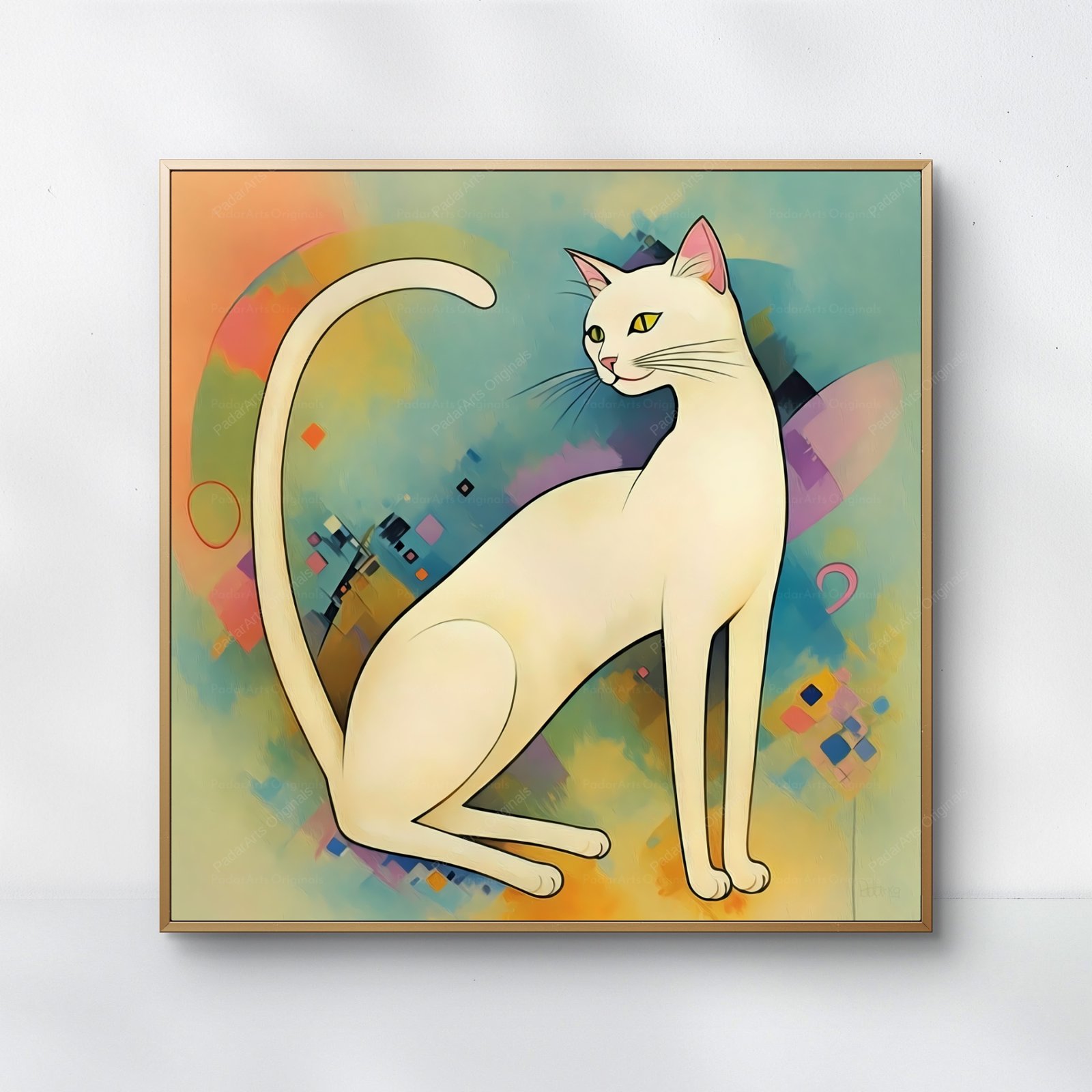 This captivating artwork draws clear inspiration from Wassily Kandinsky (1866-1944), a pioneer of abstract art. The artist employs a vibrant color palette and dynamic composition reminiscent of Kandinsky’s works, where forms and colors intertwine to evoke emotions and spiritual experiences. The graceful lines of the cat’s body create a sense of fluidity, contrasting with the geometric shapes and blocks of color in the background. These abstract elements seem to dance around the feline figure, adding a sense of energy and movement to the piece. While the cat provides a recognizable focal point, the overall effect is one of abstract expressionism, inviting viewers to interpret their own meanings and feelings. The artwork beautifully blends representation and abstraction, capturing the essence of Kandinsky’s innovative spirit.